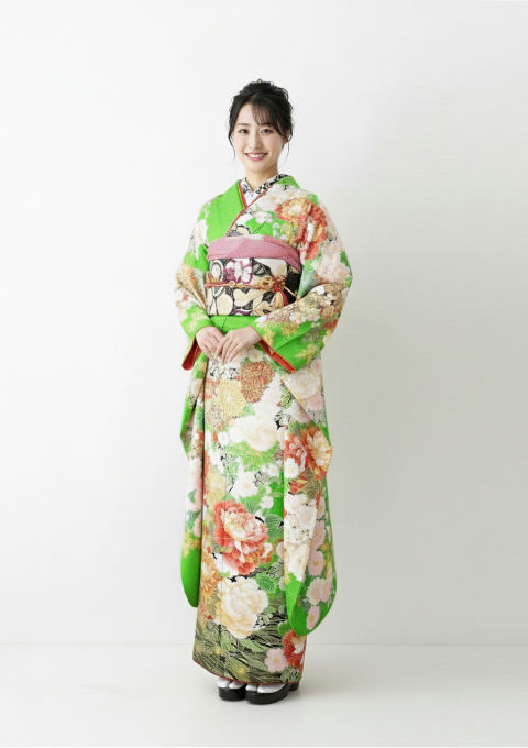 鮮やかな緑色の振袖を着た女性の写真です。振袖には、ピンクや白の大きな花が美しく描かれ、豪華で華やかな印象を与えています。振袖全体に羽や花、植物模様が描かれており、自然を感じさせるデザインが特徴的です。帯は深い赤と金の色合いで、複雑な模様が施されており、全体的に華やかで豪華な印象を引き立てています。背景はシンプルで白い色調にまとめられており、振袖のデザインが際立つようになっています。この振袖は、特別な行事や成人式にふさわしい装いです。