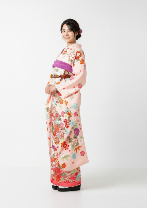 やわらかなピンク地に、カラフルな花柄が散りばめられた華やかで可愛い振袖。