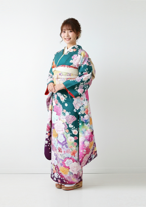 深みのあるグリーン地に、やさしい色合いの花柄が全体に広がる上品な古典振袖。