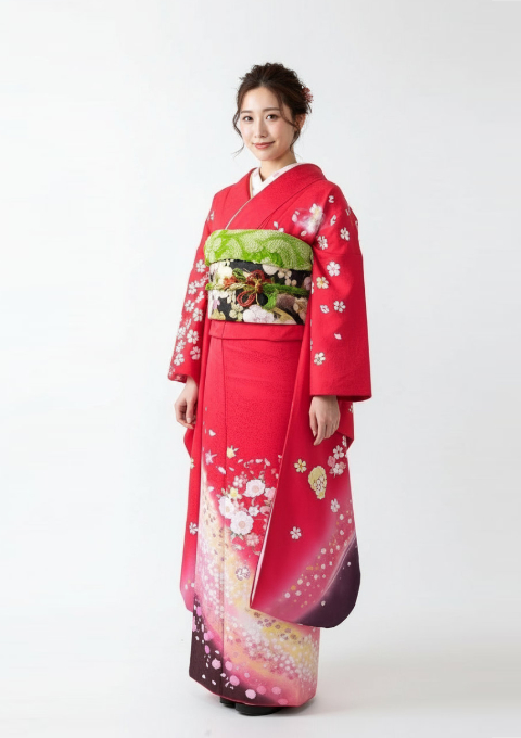 華やかで目を惹く【赤振袖×グラデーションデザイン】。