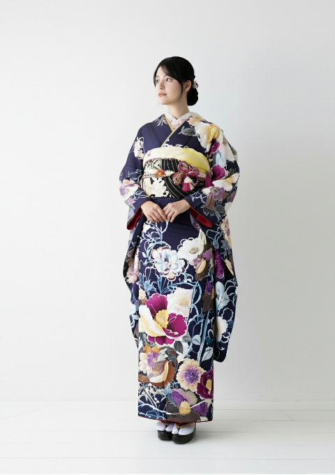 深みのあるネイビーに、存在感のある花柄が映える大人振袖。