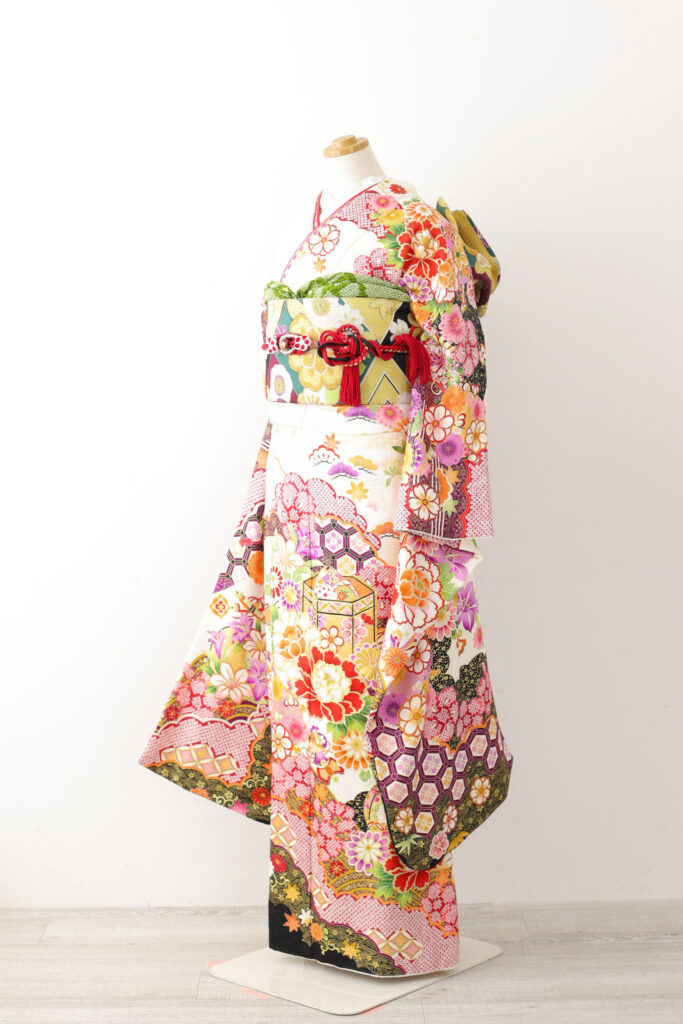 白地に赤やピンクの花々を咲き誇らせた、華やかで可愛らしい振袖。