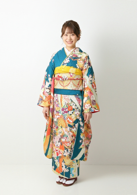 ターコイズブルーをベースに、色とりどりの古典柄が華やかに広がる振袖。