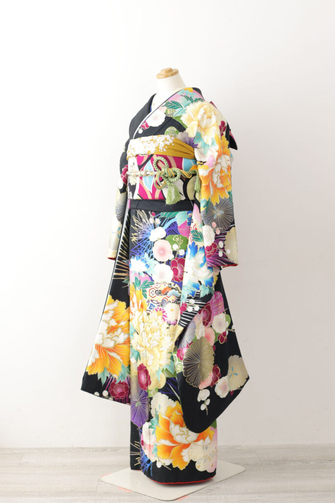 黒を基調に、華やかな花柄が全体にあしらわれた振袖です。ピンク、黄色、青などの色鮮やかな花々が目を引き、上品で華やかな印象を与えます。帯はゴールドと黒を基調にした華やかなデザインで、全体を引き締めつつバランスを取っています。