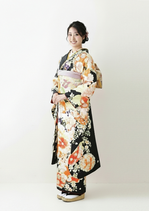 黒地をベースに、オレンジや生成りの花柄が映える大人華やか振袖。