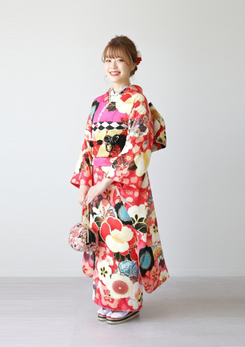 【20-74】赤×ピンク振袖|市松柄が映えるレトロモダン振袖
