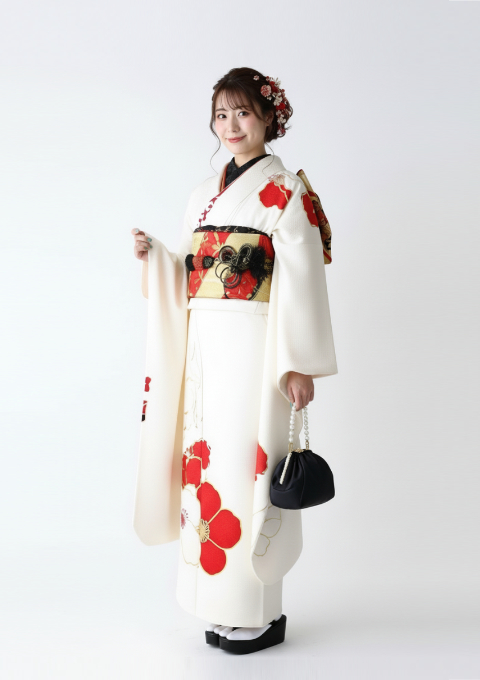 やわらかな白地に、凛と映える赤い花が印象的な振袖。