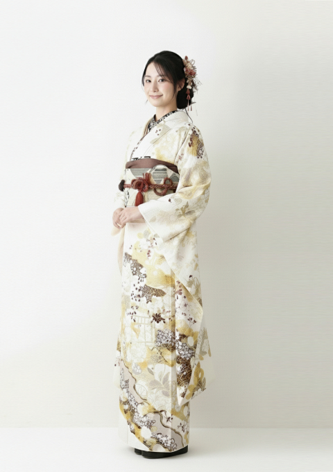 やさしい白ベースに、ゴールドやベージュのニュアンスカラーが溶け込む上品な振袖。