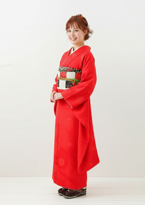 鮮烈な赤地に、地紋で鶴が優雅に舞う「九重×中村里砂」の振袖。