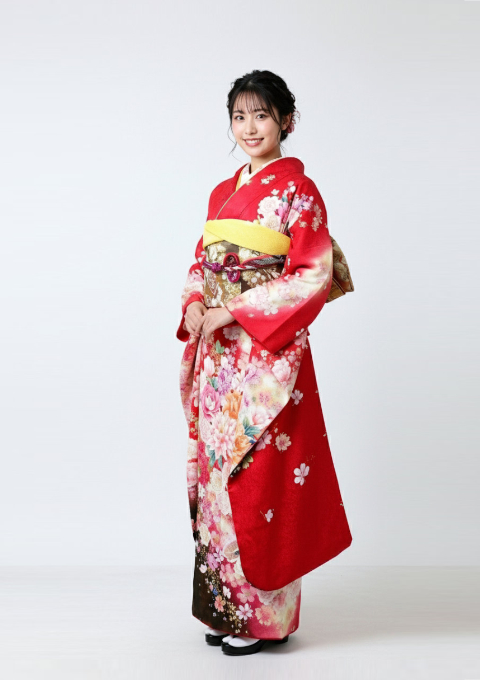 赤地にピンクや白の花々が描かれており、華やかで可愛らしい印象を与える振袖です。帯には落ち着いた茶色をベースとし、黄色の帯揚げやピンクの帯締めがアクセントとなって全体の彩りを引き立てています。大胆かつ優美な花柄と赤のグラデーションが相まって、若々しく洗練された和装の魅力を存分に感じられる一着です