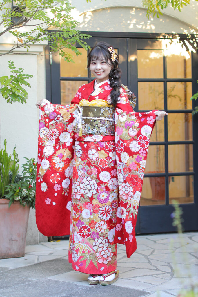 鮮やかな赤地に、牡丹や菊、桜などの吉祥文様をあしらった王道の振袖。