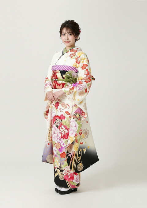 多彩な花柄が美しく映える、華やかさと上品さを兼ね備えた振袖。