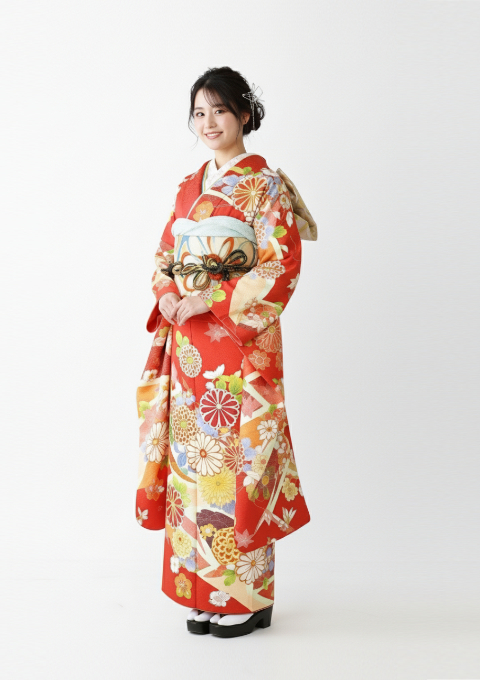 深みのある赤をベースに、菊や梅などの古典花柄を贅沢にあしらった華やかな振袖。