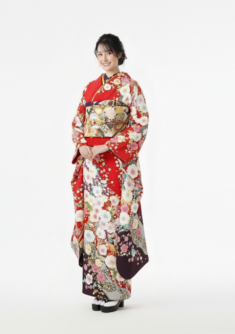 鮮やかな赤をベースに、白や淡い色合いの花柄を重ねた上品で華やかな振袖。