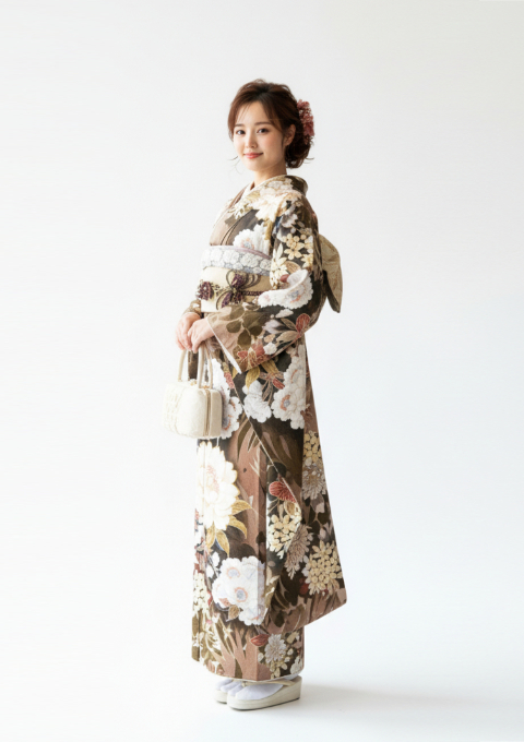 くすみベージュ×ブラウンのニュアンスカラーが上品で大人かわいい振袖。