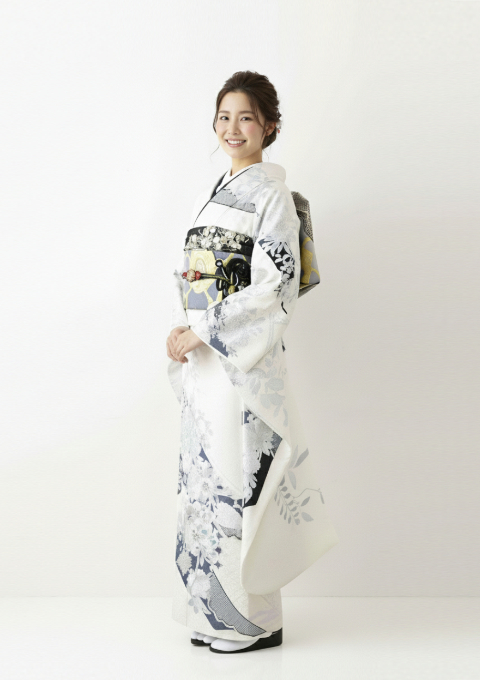 白をベースに、グレーと淡いブルーが重なる透明感たっぷりの振袖。