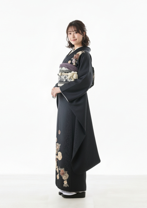 深みのある黒地に、控えめな古典柄をあしらった大人シックな振袖。