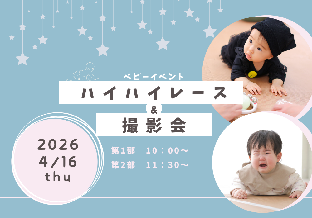 まずは、ハイハイレース!元気にベビーたちがハイハイで競い合っていただき、最後は表彰式!その後、お子様の撮影会となります!